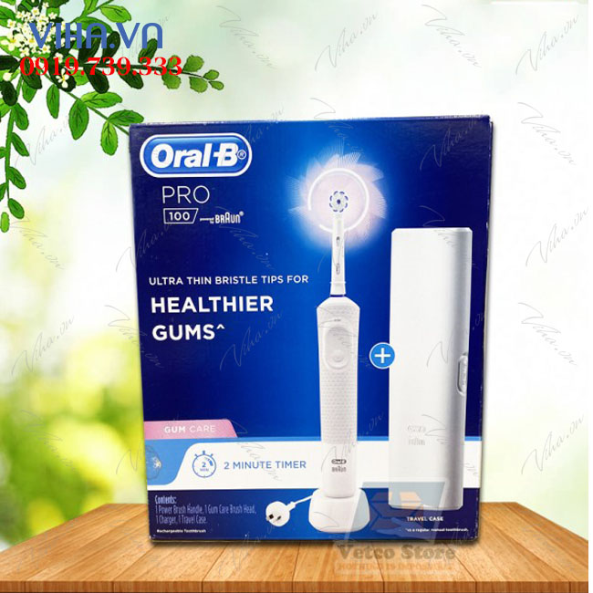 Bàn chải đánh răng điện Oral B Pro 100 Gum Care có tay cầm màu trắng với lông bàn chải để làm sạch vượt trội so với bàn chải đánh răng bằng tay thông thường Pin có thể sạc lại: Kéo dài đến 8 ngày (2 phút, 2 lần / ngày)
