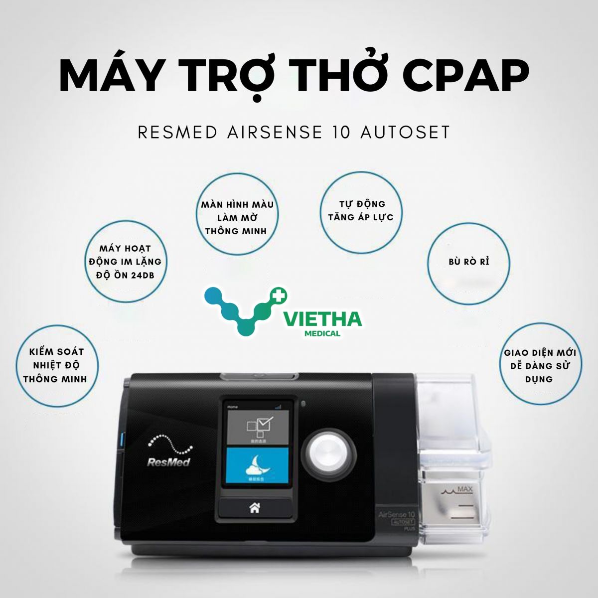 ResMed | AirSense 10 AutoSet | Tự điều chỉnh áp lực, kết nối dữ liệu online | 4–20 cmH₂O | Thương hiệu cao cấp, độ bền cao |