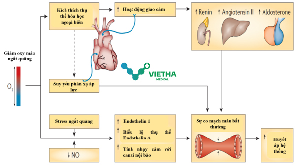 Sơ đồ tim mạch: thiếu oxy → tim phải tăng co bóp → rối loạn nhịp.
