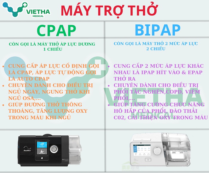 Máy trợ thở là thiết bị hỗ trợ hô hấp quan trọng dành cho bệnh nhân bị các bệnh liên quan đến đường hô hấp. Máy trợ thở chia làm hai loại, máy trợ thở một mức áp lực dương Cpap và máy trợ thở 2 mức áp lực dương Bipap