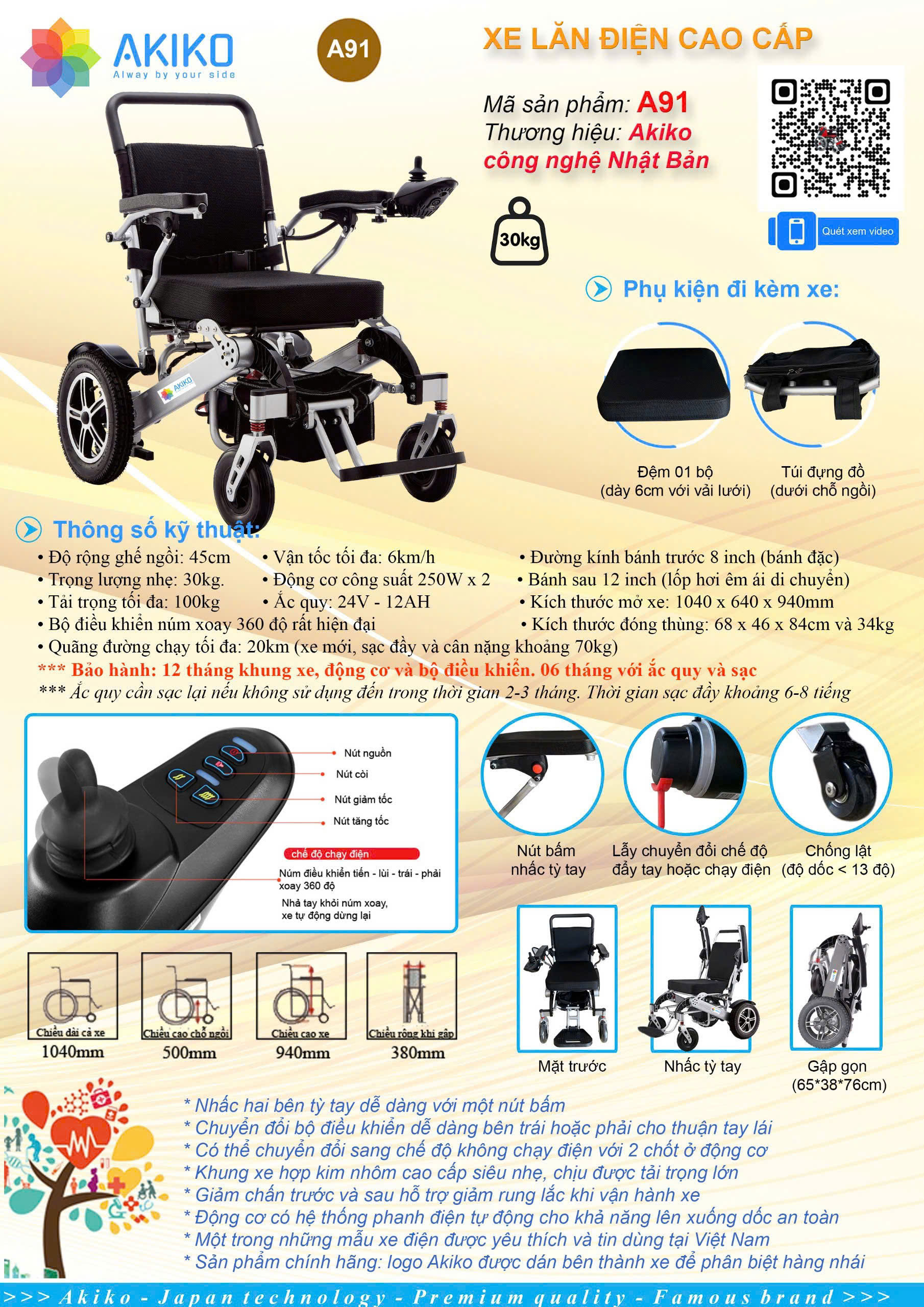 Xe lăn điện Akiko A91 thuộc phân khúc cao cấp, là phiên bản nâng cấp của các dòng xe đã ra đời trước đó vì gọn nhẹ và bền đẹp hơn, đáp ứng nhu cầu ngày càng cao của người tiêu dùng.